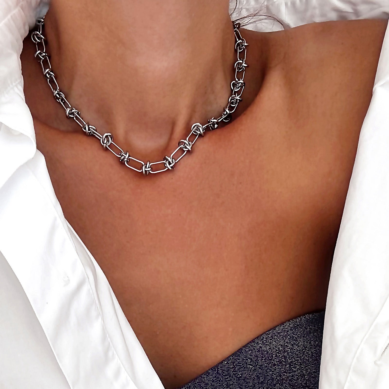 Elegantna ogrlica kragna forme, izrađena od jednog komada nerđajućeg čelika u boji srebra. Aura choker prati liniju vrata i ostavlja utisak svedenog, modernog stila uz dozu samopouzdanja.